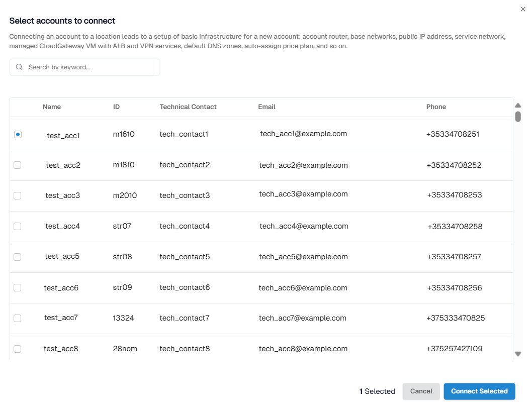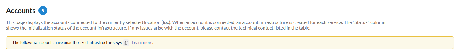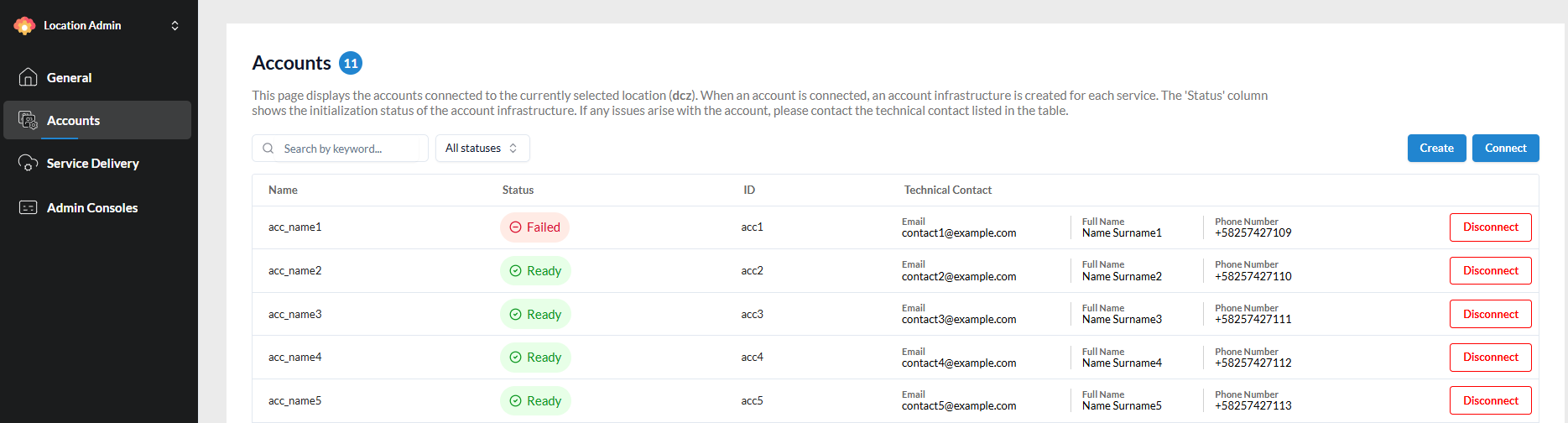 Accounts tab shows a list of accounts which have infrastructure in selected location and are entitled to use this location. When an account is connected, an account infrastructure is created for each service.