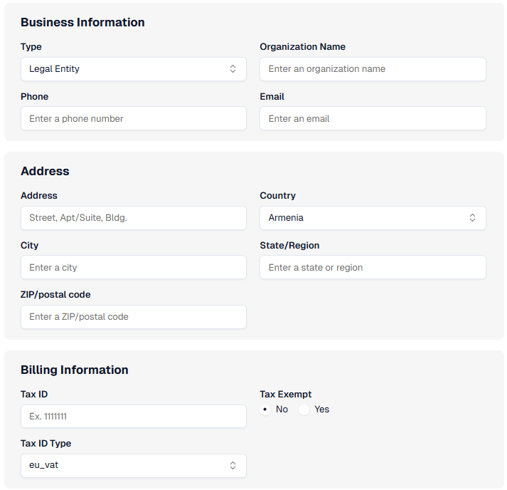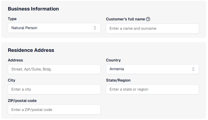 Business informationsection, depending on the type:Natural personorLegal entity, fill in the required fields. - Click