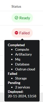 CreatingorDeletingstatuses shows details about the account connection or disconnection process: a list of services with created or deleted infrastructure, as well as the deployment or removal date and time. - Hovering over the