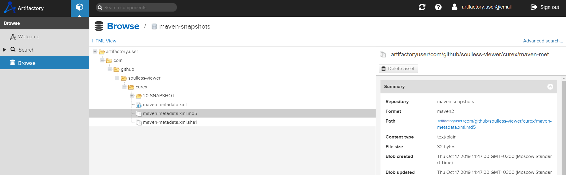 In the artifact card, you can view its contents and properties, download or copy them, as well as move or delete the artifact.