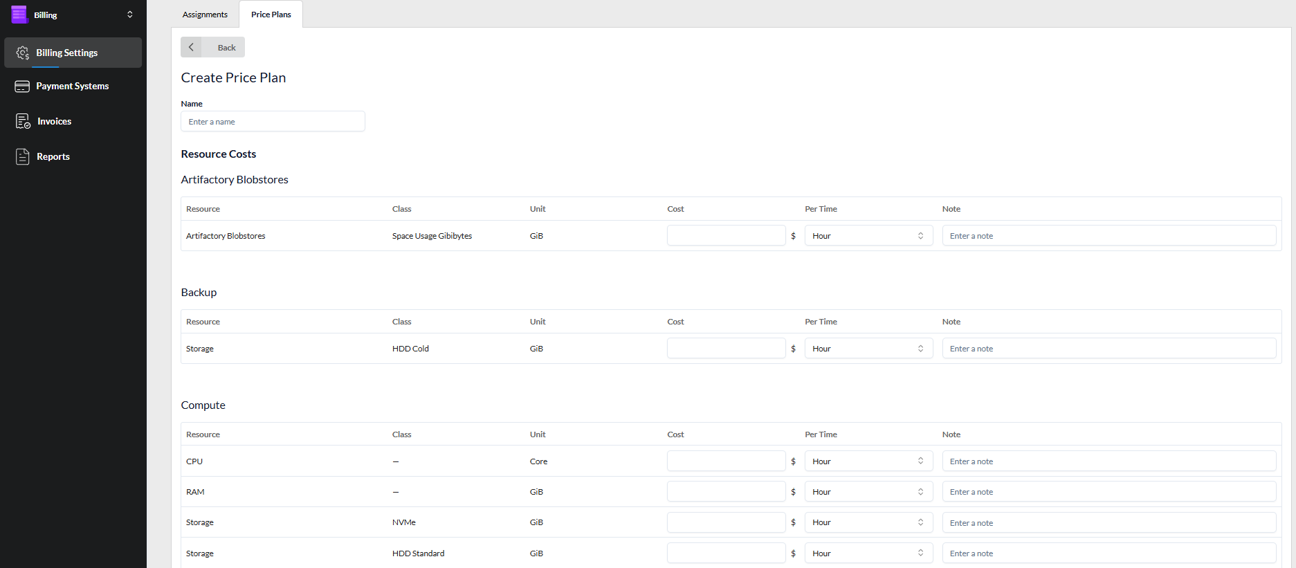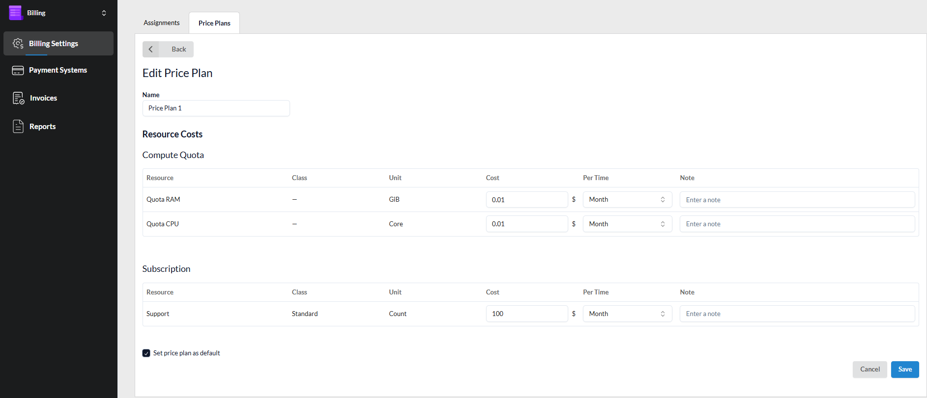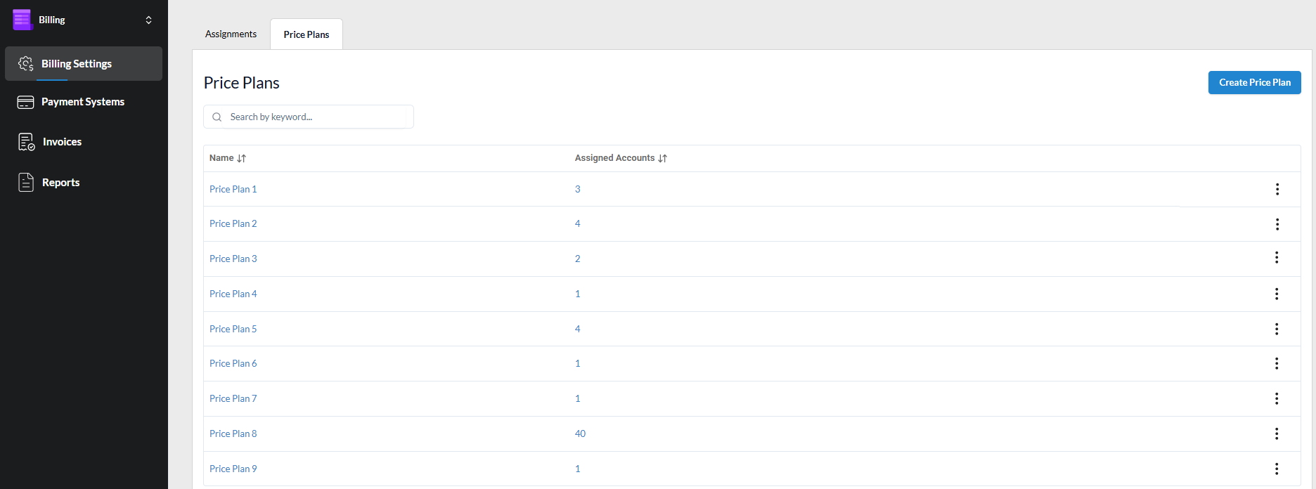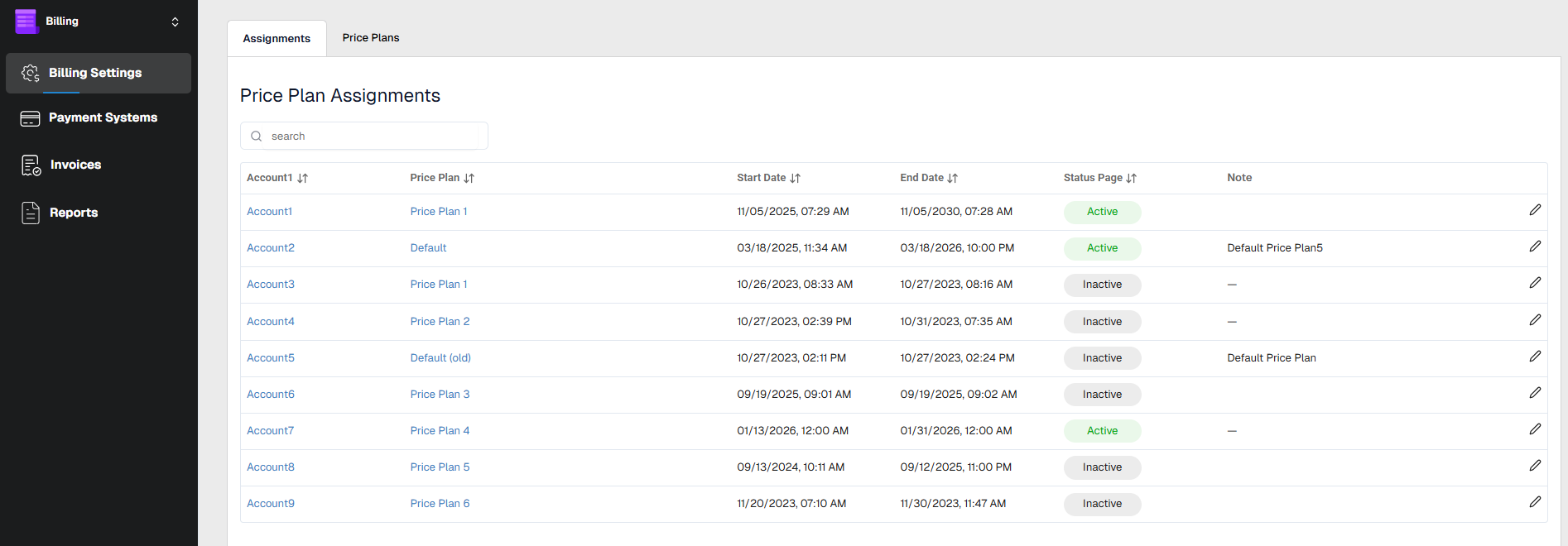 The Billing Settings tab is designed to assign price plans to different accounts.