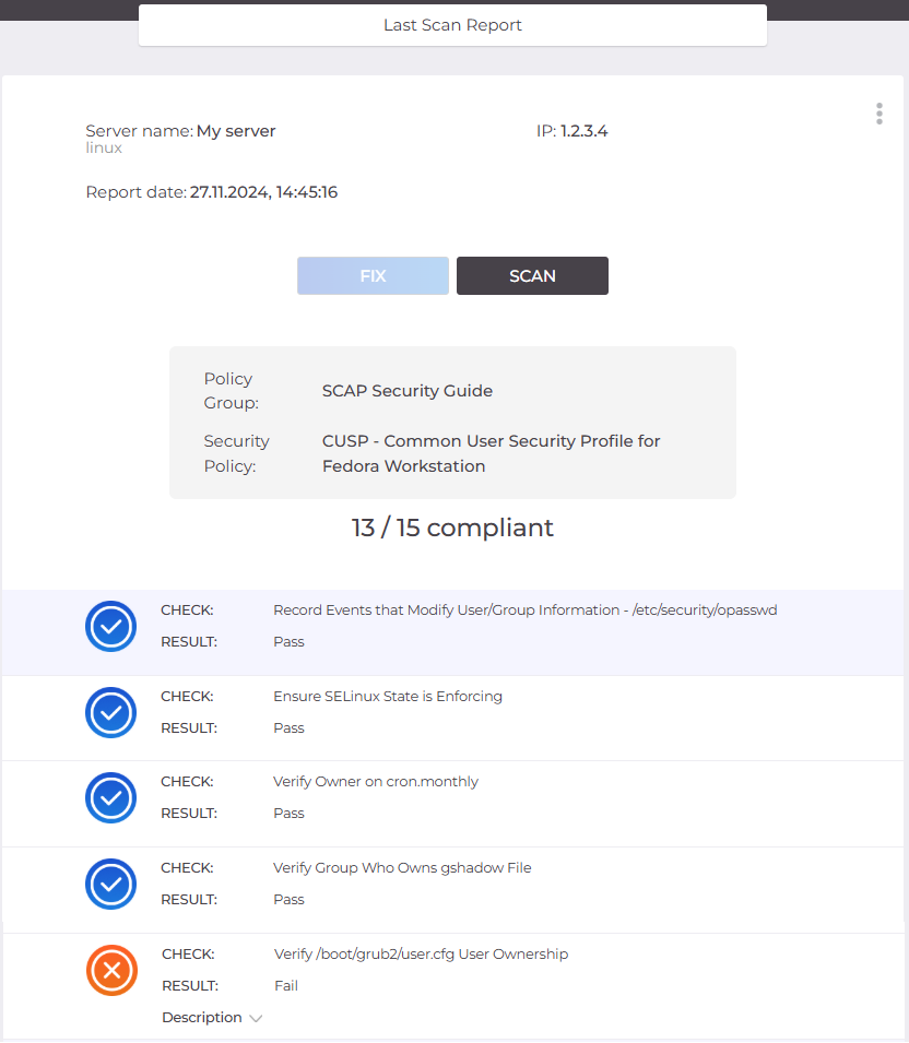 If errors are detected during the server check, click the Fix button to initiate automatic vulnerability fix and re-scan the server.