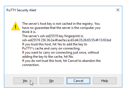 The first time you connect to the VM, PuTTY asks you to confirm that you trust the server. Choose Yes to save the server identity in PuTTY's cache or No to connect without saving the identity.