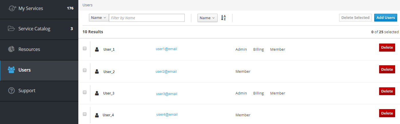 After logging into the system, you will find yourself on the My services tab. In the left menu, there are also tabs Service catalog, Resources, Users, and Support.