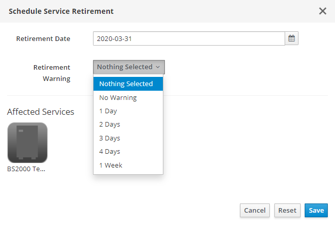 Any user can set the date of the scheduled service retirement and warnings about it.