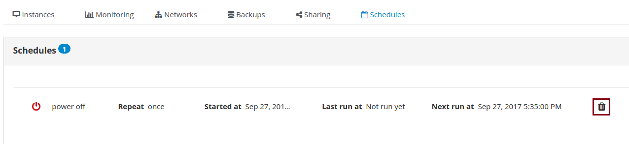 Start- send a request to switch on the service;Shutdown- send a request to switch off the service; ;Force stop- stop all VMs immediately;Schedule Power Off- set shutdown time;Schedule Power On- set on time.