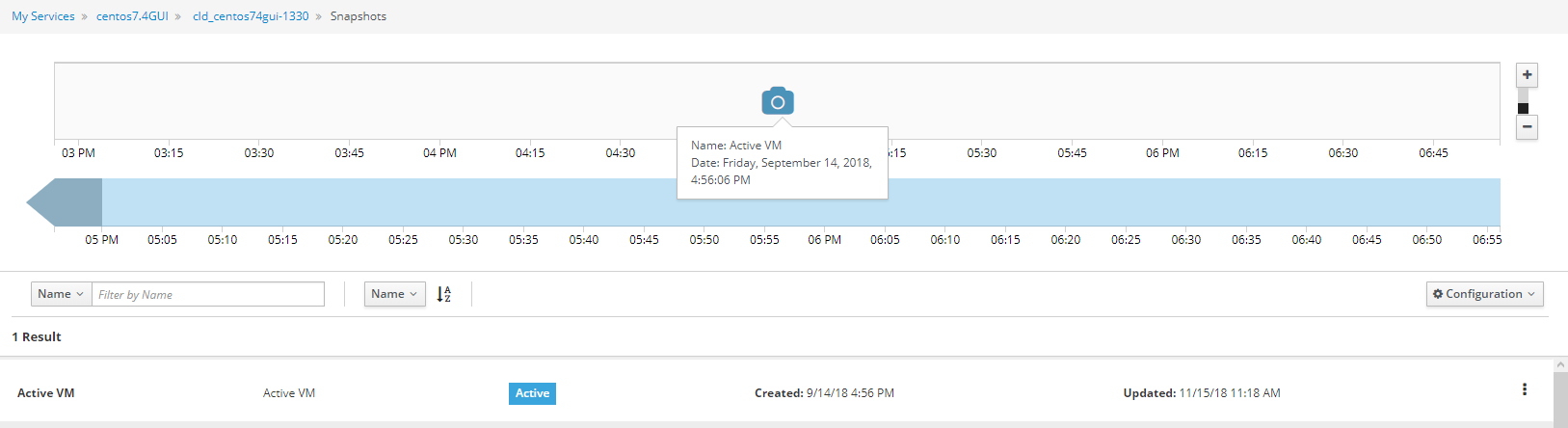 Below the timelines is a list of created snapshots and the Configuration button, which can be used to Create snapshot.
