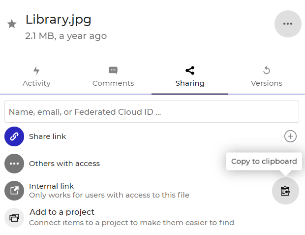 By pressing this button, you can quickly copy the link to the file to the clipboard (works only for those who have access to this file or folder).