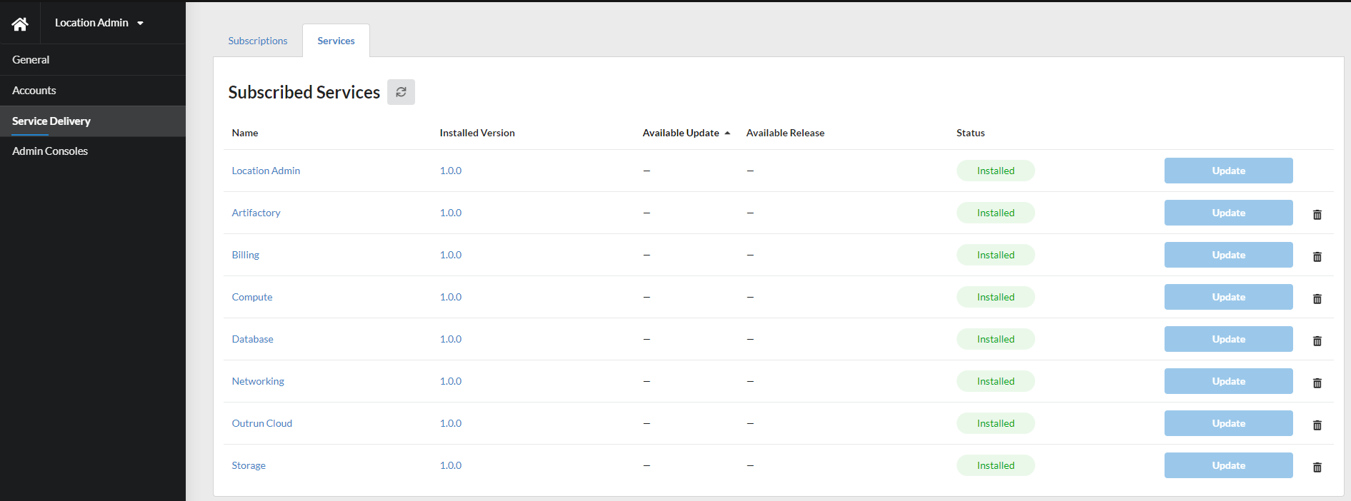 Service Delivery is a part of the Location Admin service that allows cloud owners to view subscriptions to cloud platform services. It serves as a centralized place for viewing, managing, and updating cloud services.