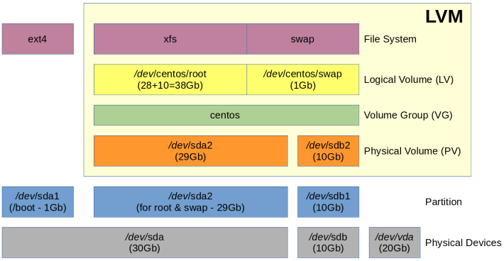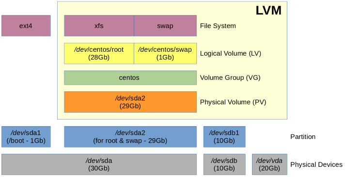 - The /dev/sda2 (29Gb) partition is an extended LVM partition on which the /dev/sda2 physical volume is created.