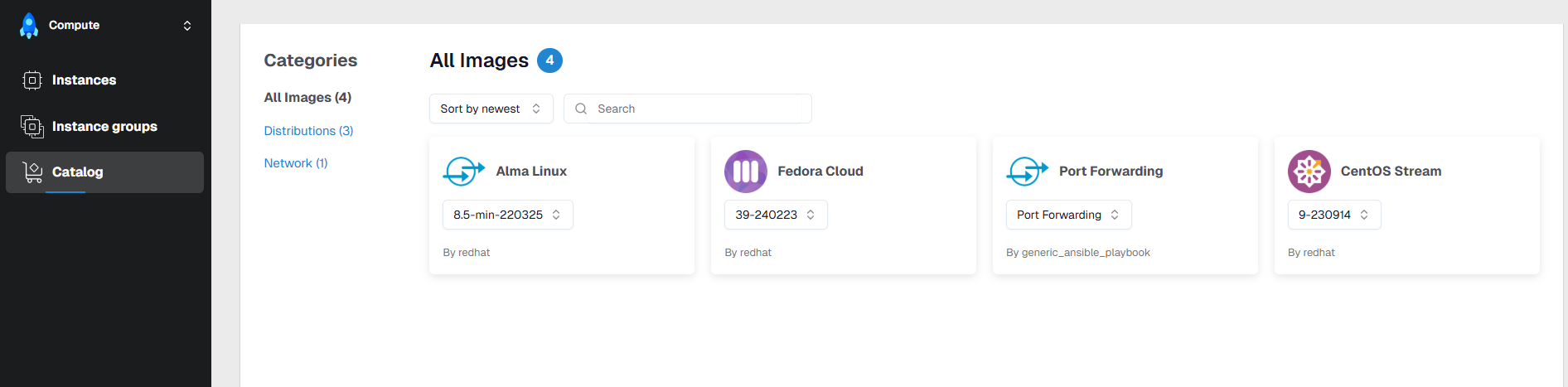 The Catalog tab provides access to a catalog of ready-to-use images and templates designed for quick and convenient creation of virtual machines and VM groups.