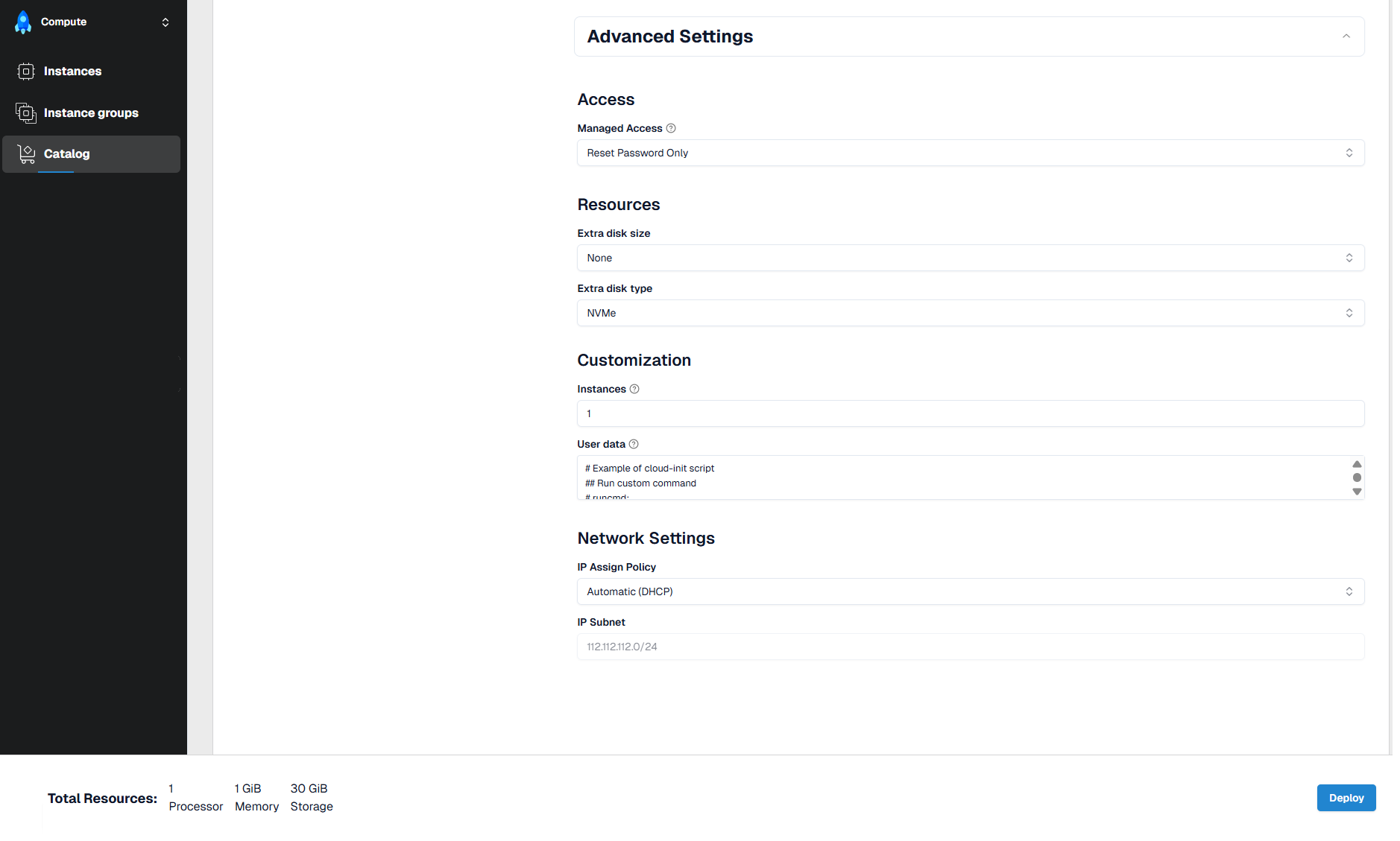 Instances– the number of virtual machines with the selected configuration within a single service (Instance Group);User Data– user-defined configuration (Cloud-Init or Sysprep) used to automate VM setup after deployment (installing packages, configuring access, running scripts, etc.).