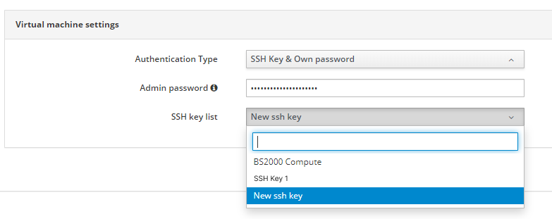 The authentication types SSH Key or SSH Key & own password are selected from the expanding list containing existing keys. When selecting New ssh key it's possible to add a key directly from the ordering form. This key will then be used for provisioning purposes and will not be saved in the user profile.