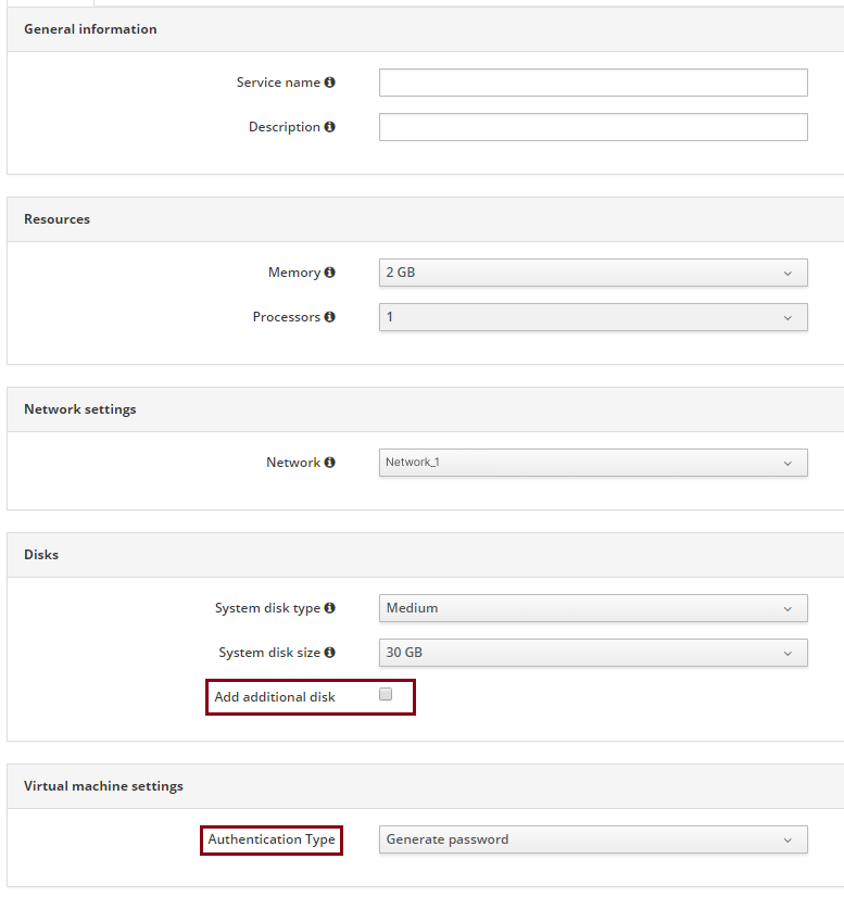 Service Name- short description of the new service (characters of the Latin alphabet only);Description- more detailed description of the created service;Memory- the amount of RAM required to run the virtual machine;CPU- the number of CPUs required to run the virtual machine;Network- can be selected from the list of available networks.