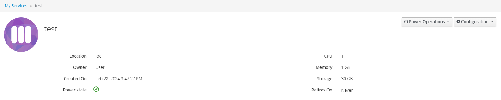 Location: physical location of virtual machines;Owner: owner of the service;Created On: date and time the service was created;Power State: virtual machine activity indicator;Memory: total amount of RAM reserved for the entire service;CPU: total number of CPUs reserved for the entire service;Storage: total size of disk space (GB);Retires on: scheduled retirement date.