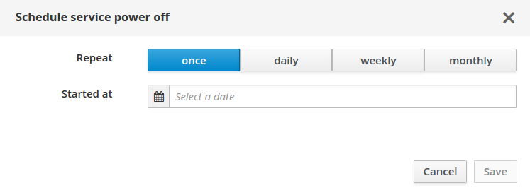 Service power management can be set by means of the schedules. To set a power schedule, go to the Power drop-down menu and select Schedule Shutdown or Schedule Start. Then, choose the frequency (Repeat), date, and time of the first action.