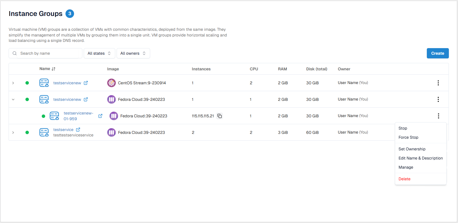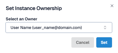 To change the owner of an instance group, select Set Ownership from the context menu. In the modal window that opens, choose a user from the dropdown list: