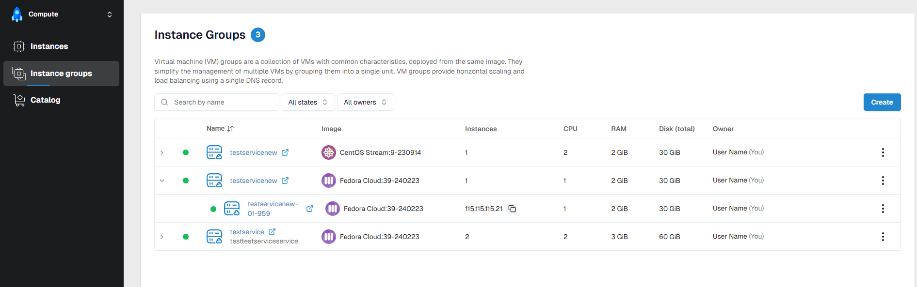 The operational state of an instance group is represented by a status and a color indicator displayed in the table row next to the VM group name.