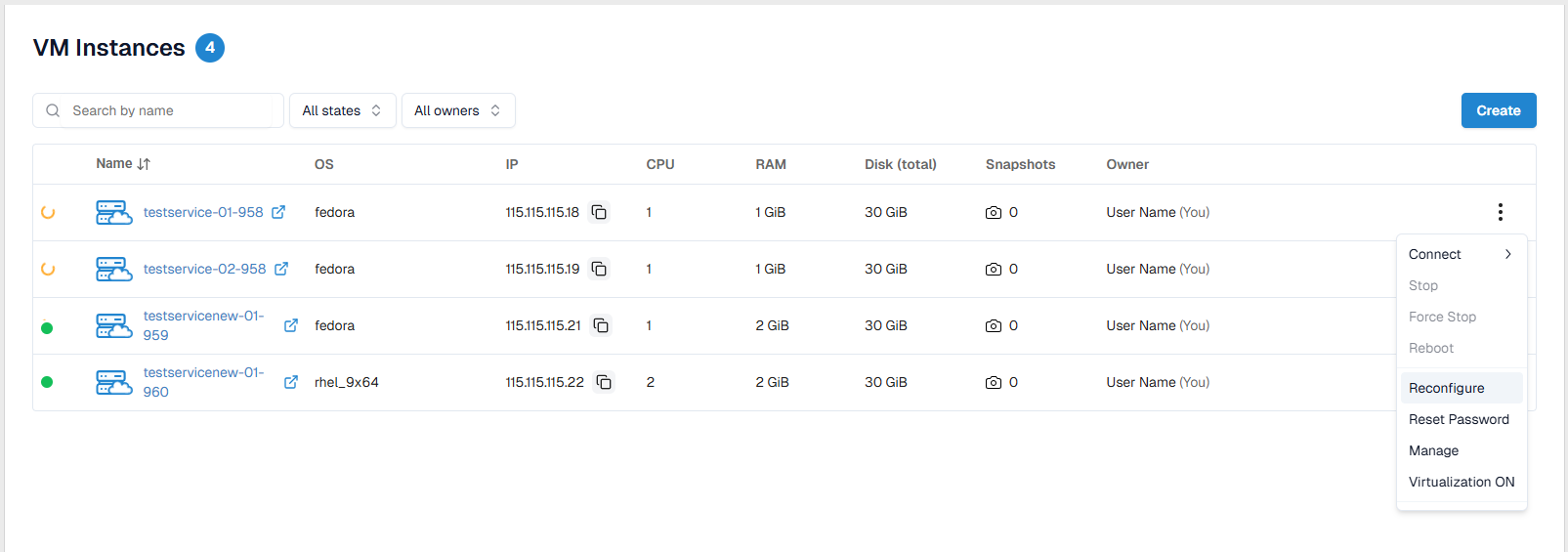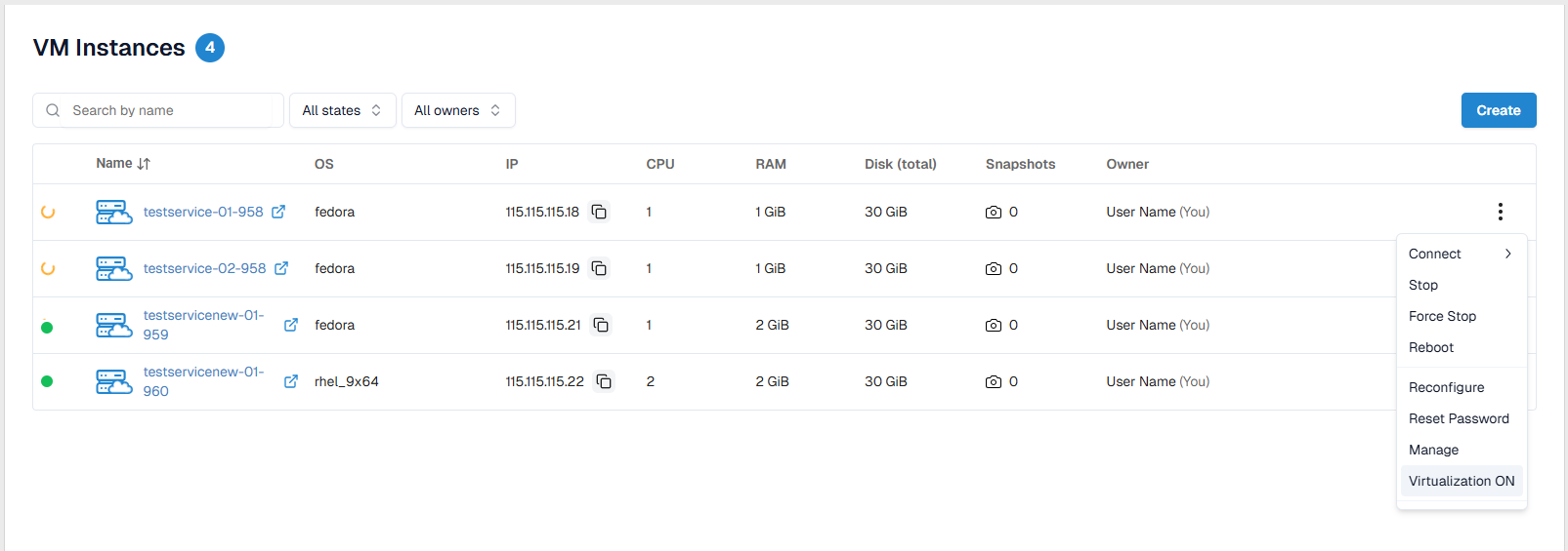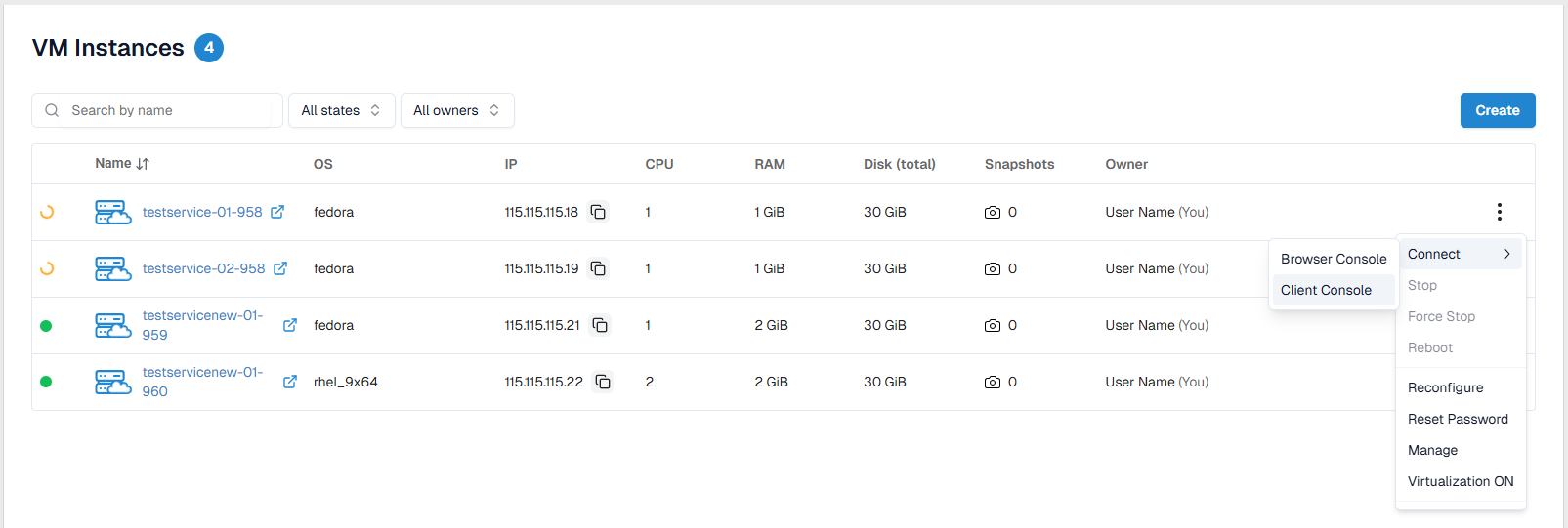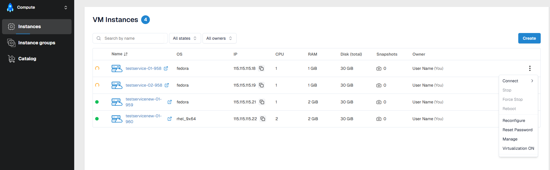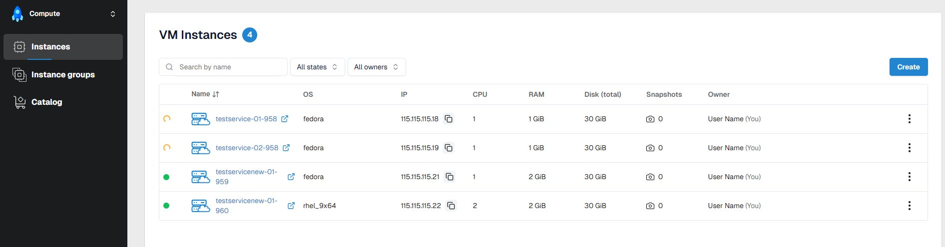 Createbutton — performed by ordering a virtual machine image from the Catalog; - Quick identification of the current VM status using visual indicators.