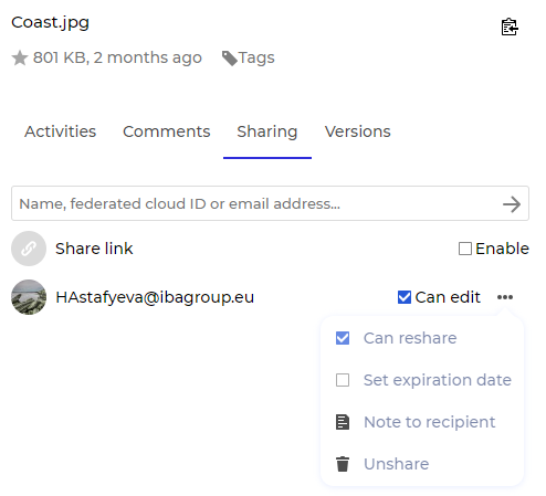 If the target user does not have access to this file or folder, then it can be shared via a link by clicking on Copy to clipboard to the right of Share link. By clicking on the icon of additional actions, you can set access rights, as well as create additional links. When sharing certain files or folders, the user can grant a temporary or permanent access to edit or read only to any folder or file.