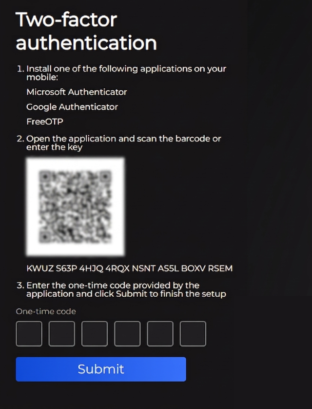 Username or emailandPassword. - Enter the one-time password (OTP) generated by your authenticator app.