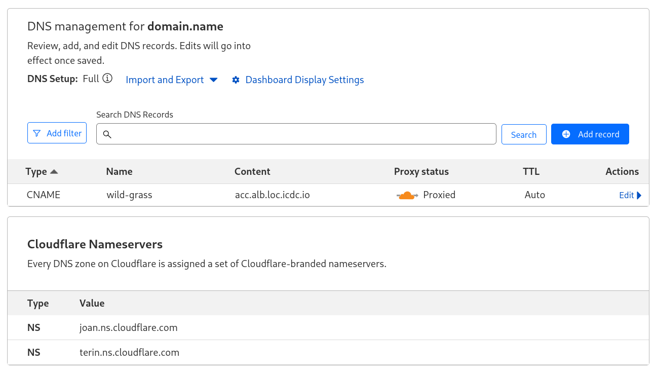 The best option usually is to configure a full DNS Setup, where the DNS domain is moved to the nameservers of the DDoS protection provider.