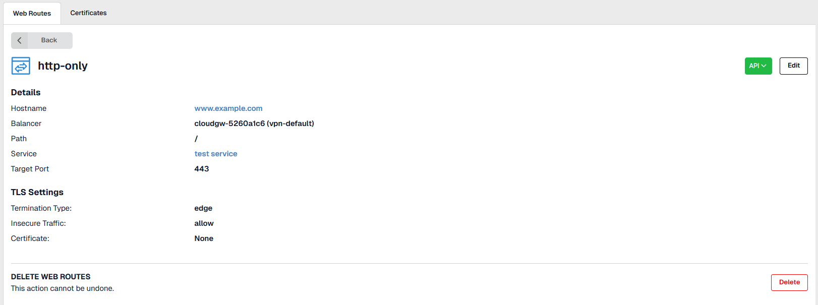 - None (empty value) – HTTP traffic is completely blocked. The route is available only via HTTPS, and any requests over the insecure protocol will be rejected.