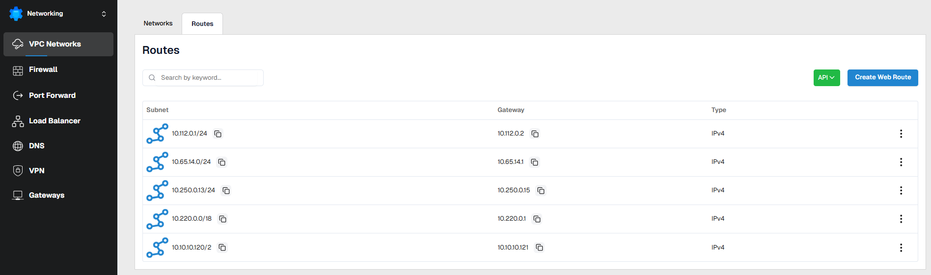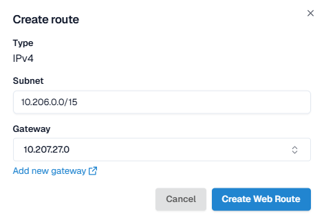 To create a new route, click the Create Web Route button. In the dialog that appears, enter the subnet IP address, select a route gateway from the list of available ones, and click Create Web Route.