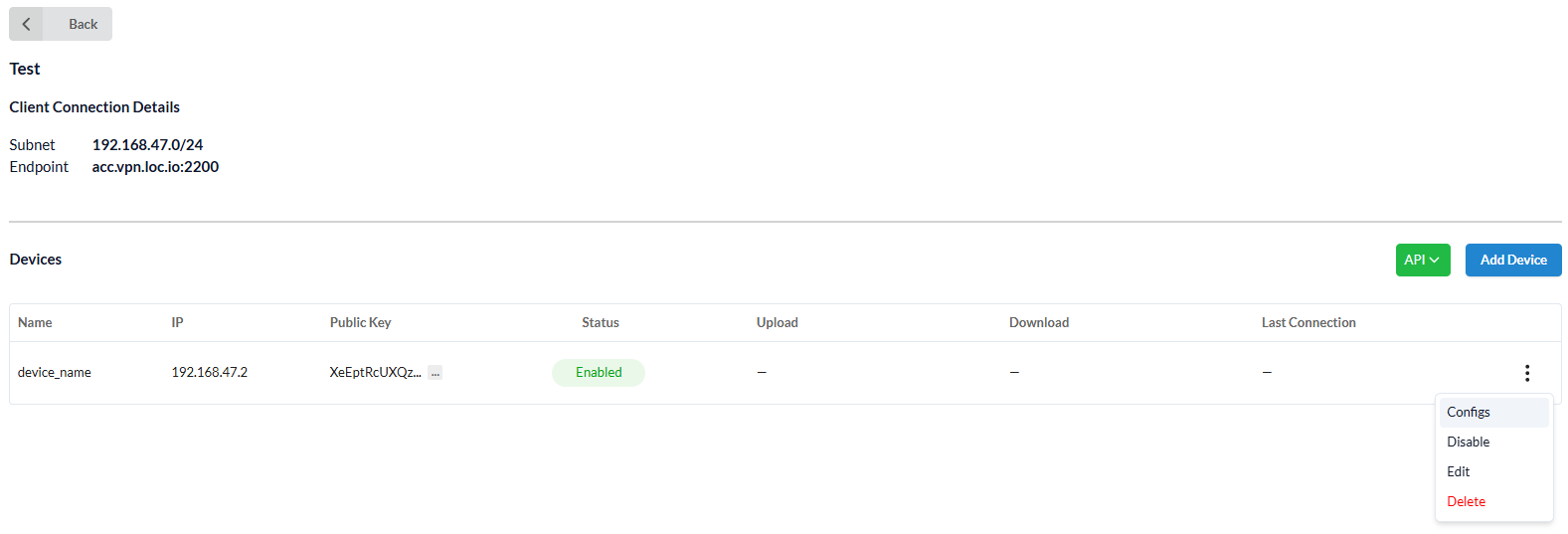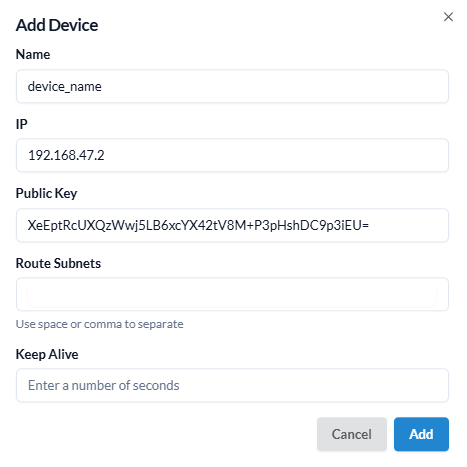 IP– the automatically suggested available address (from the subnet specified when creating the connection), in this case192.168.47.2;Public Key– the user’s WireGuard public key;