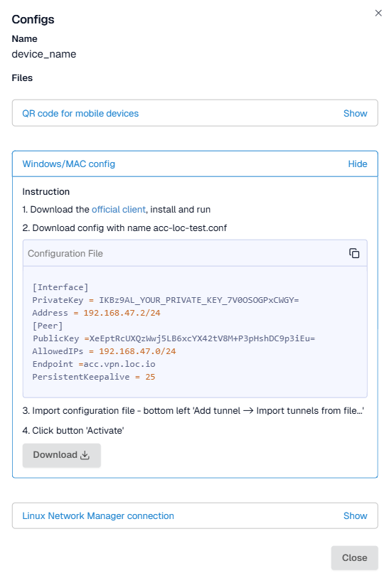 Follow the built-in instructions for your operating system. Use the generated configuration file or QR code to establish the connection.