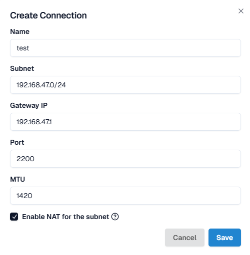 Specify the previously selected subnet (for example:192.168.47.0/24);Gateway IP– the IP address of the gateway (for example:192.168.47.1);Port– UDP port on the public IP address;