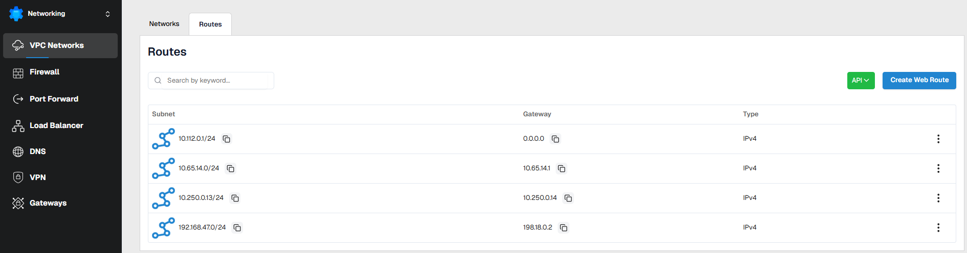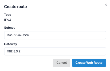 Subnet– in this case,192.168.47.0/24;Gateway– the internal address of the previously created VPN connection (in this example,198.18.0.2).