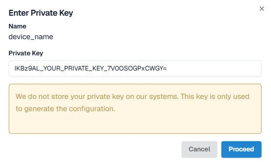 In the opened modal window, enter your WireGuard Private Key and click Proceed.