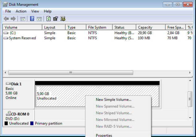 Добавление диска и создание раздела в Windows происходит следующим образом: