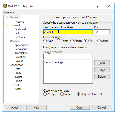 На экране настроек PuTTY заполните поле Host Name (or IP Address) IP-адрес вашей виртуальной машины, которое можно найти на панели управления. Убедитесь, что в графе порта стоит 22 и для типа соединения выбрано SSH.
