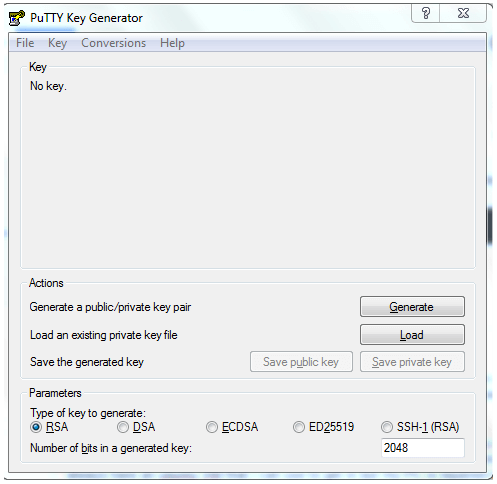 После установки запустите PuTTYgen при помощи меню Старт или нажмите кнопку Windows и наберите puttygen. Программа для генерации ключей выглядит примерно так: