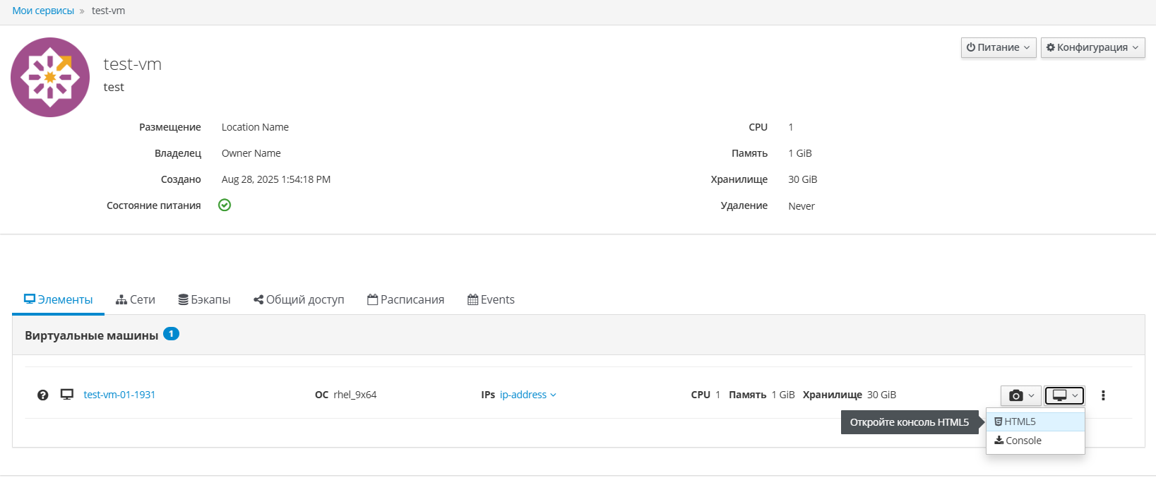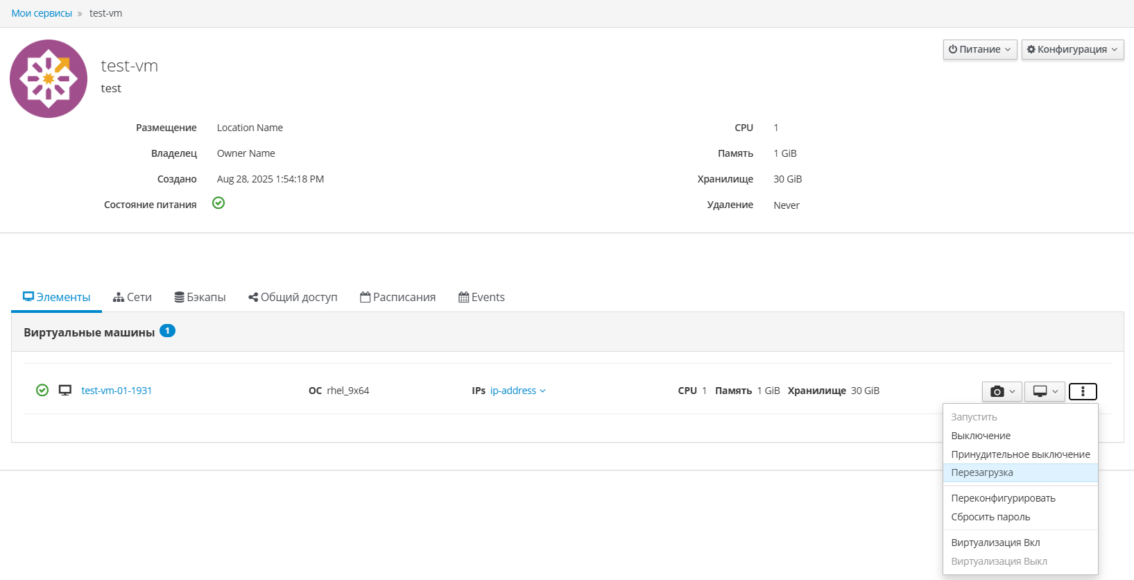 - Через интерфейс сервиса: в боковом меню виртуальной машины выберите действие