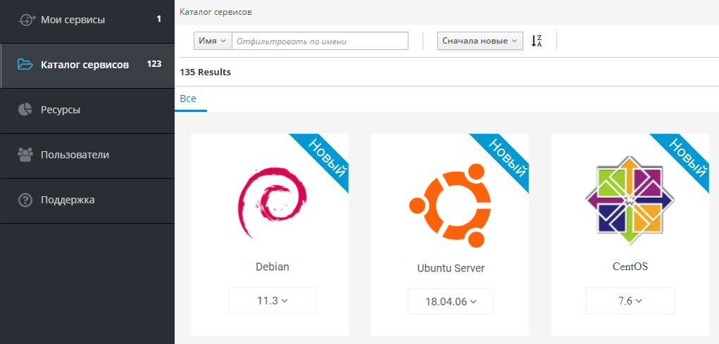 Cервисы, недавно добавленные в каталог, помечены как Новый.