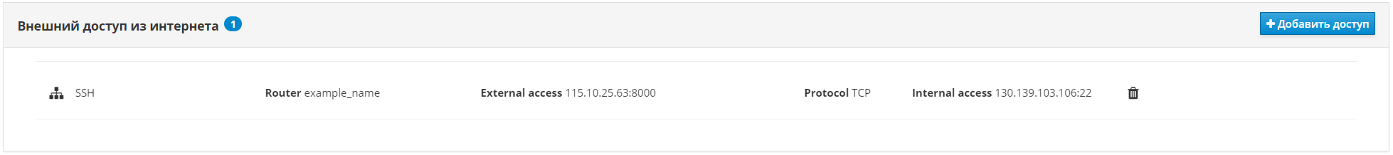 Для настройки внешнего доступа к виртуальной машине используется перенаправление портов, которое позволяет направить входящих трафик на какой-либо порт TCP/UDP с публичного IP-адреса аккаунта на частный IP-адрес виртуальной машины. Для настройки перенаправления портов необходимо указать: