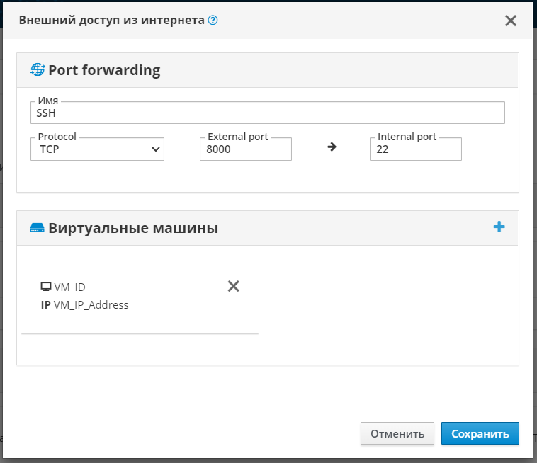 Имя(для отображения в UI и идентификации перенаправление портов).Протокол, по которому будет передаваться входящий трафик: TCP или UDP.Внешний порт- можно использовать любой свободный порт в пределах аккаунта (это проверяется автоматически), по умолчанию порты 80, 443, 2200 заняты системными сервисами. Также рекомендуем использовать порты, начиная с 8000.Внутренний порт- порт, на котором виртуальная машина будет принимать трафик.