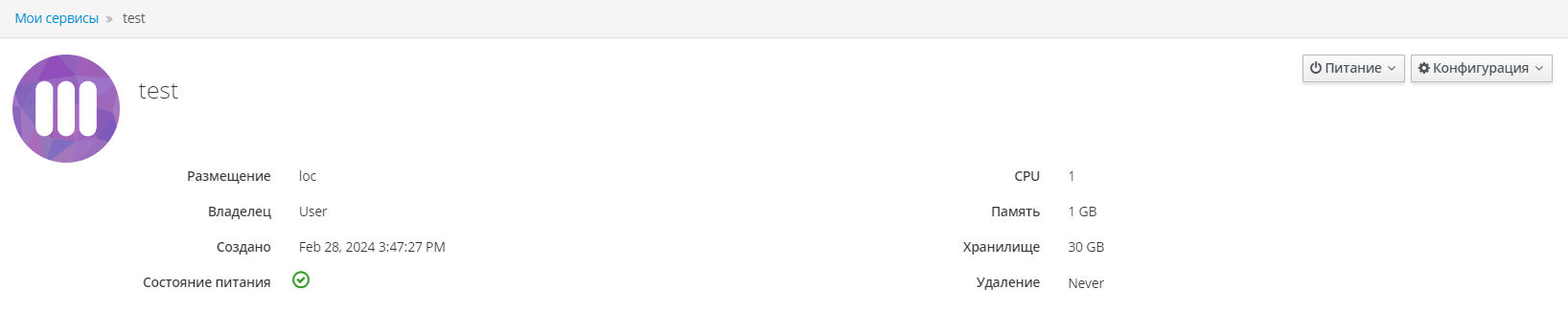 Размещение: физическое расположение (локация) виртуальных машин данного сервиса;Владелец: владелец сервиса;Создано: время и дата создания сервиса;Состояниепитания: индикатор работы виртуальных машин сервиса;CPU: общее количество процессоров виртуальных машин сервиса;Память: общий объём оперативной памяти сервиса;Хранилище: объем хранилища (Гб);Удаление: запланированная дата удаления.