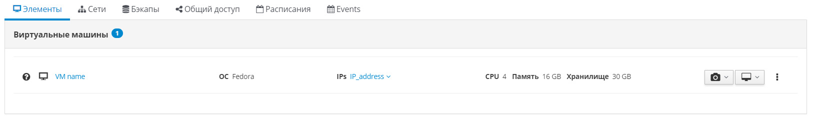 Элементы(открыта по умолчанию): список всех виртуальных машин сервиса со следующим набором информации:- Индикатор питания: текущее состояние работы ВМ,