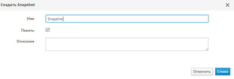 После этого откроется окно создания снапшота, в котором можно указать дополнительную информацию (имя и описание снэпшота) а также выбрать сохранение оперативной памяти (Память).
