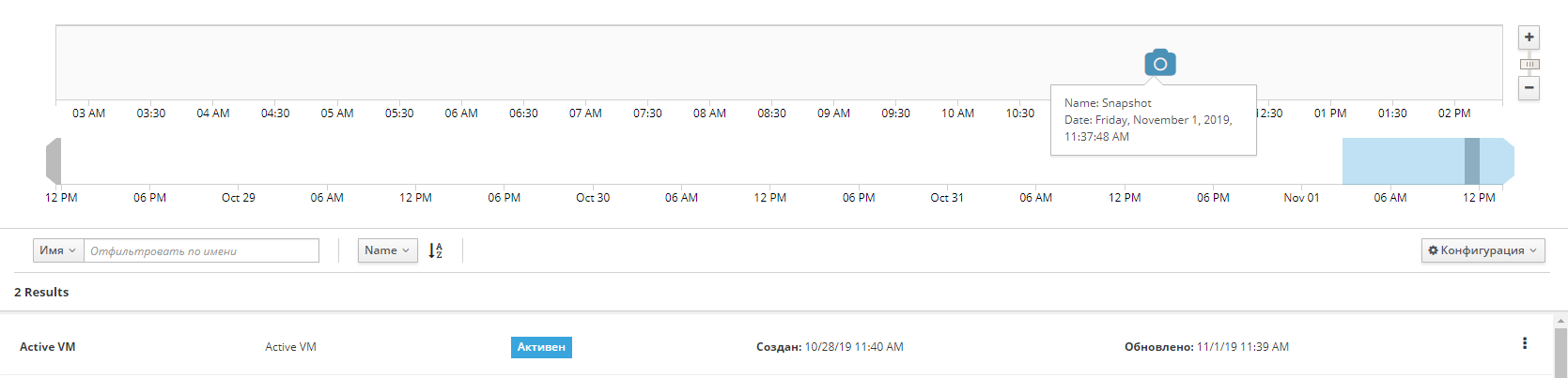 Под временными лентами расположен список созданных снапшотов и кнопка Конфигурация, при помощи которой можно Создать снапшот.
