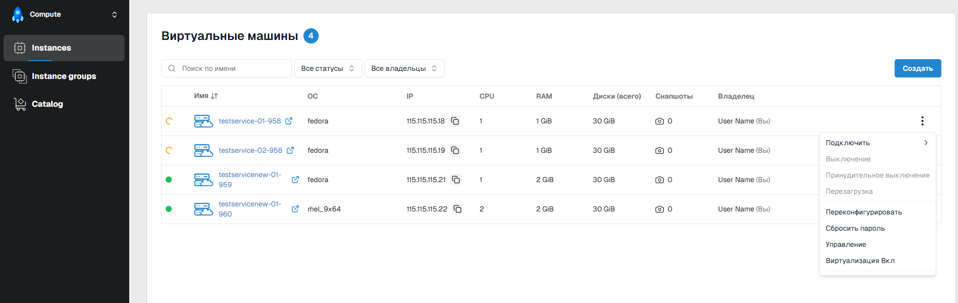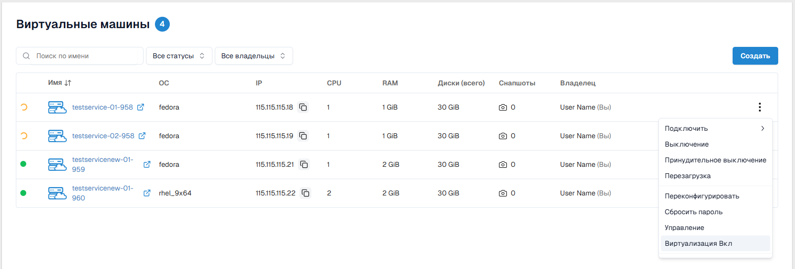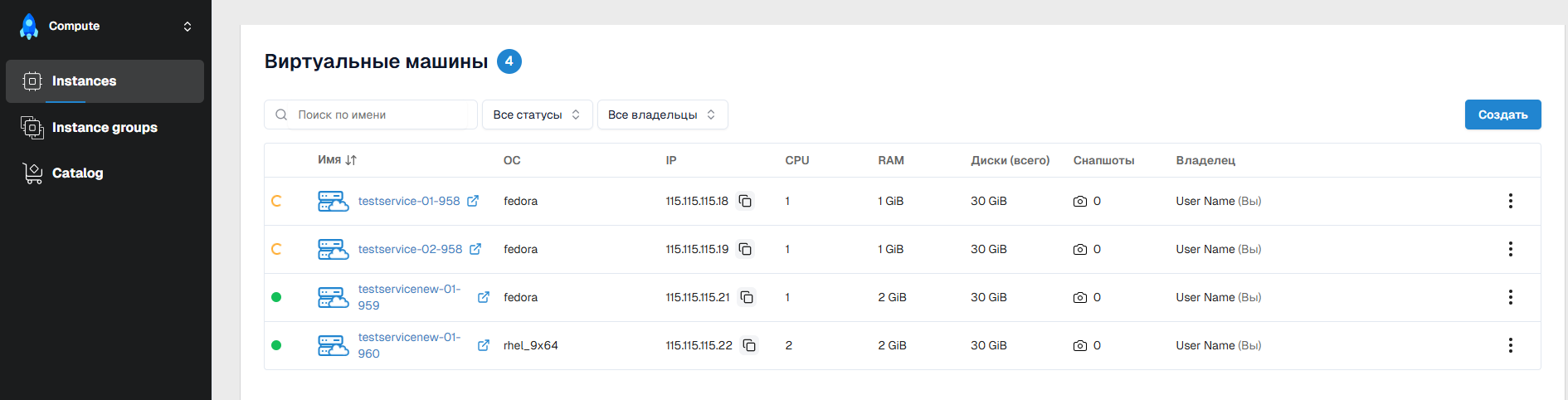 Создать- выполняется через оформление заказа образа виртуальной машины в Каталоге; - Быстрое определение текущего статуса ВМ с помощью визуальных индикаторов.