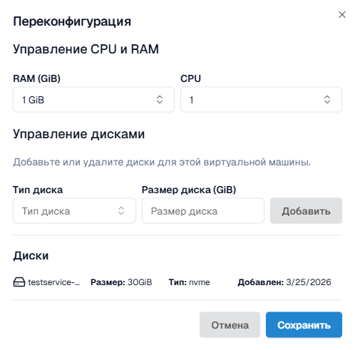 Далее в модальном окне указать новые параметры ВМ: