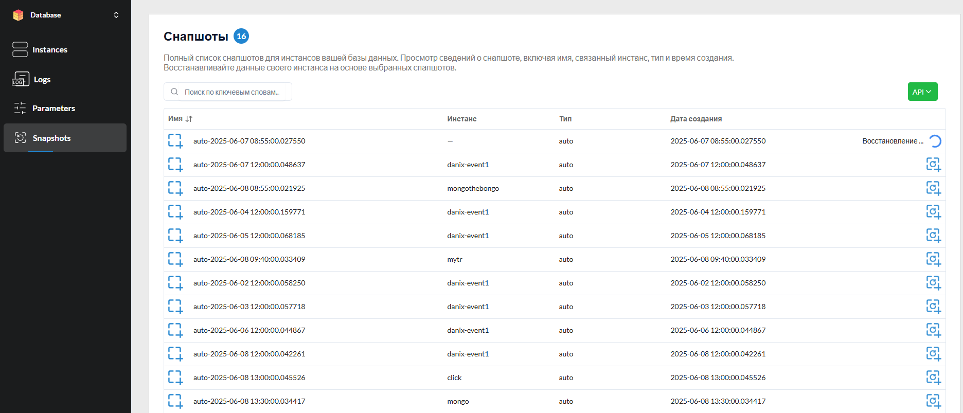 Инстанс БД можно восстановить из снапшота с помощью ICDC Database API или нажатием кнопки восстановления справа в строке необходимого снапшота.