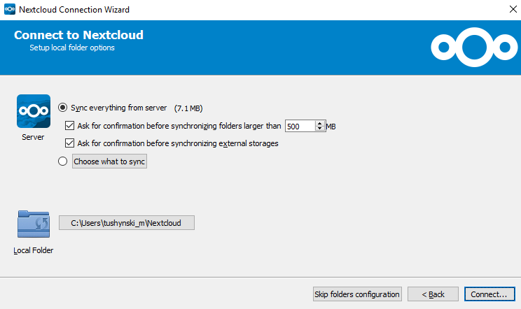 - Затем система предложит выбрать, какие файлы синхронизировать с существующими на диске, а также указать локальную папку для синхронизации: