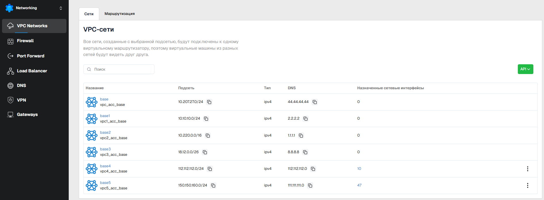 Название- уникальное имя сети;Подсеть- IP-адрес, по которому доступна подсеть (копируется в буфер обмена кнопкой справа);Типподсети - IPv4 или IPv6 (IPv6 на данный момент не поддерживается);DNS- IP-адрес DNS-сервера (копируется в буфер обмена кнопкой справа);Назначенные сетевые интерфейсы- количество назначенных сетевых интерфейсов;Меню настроеки информация о сетевых интерфейсах ВМ.