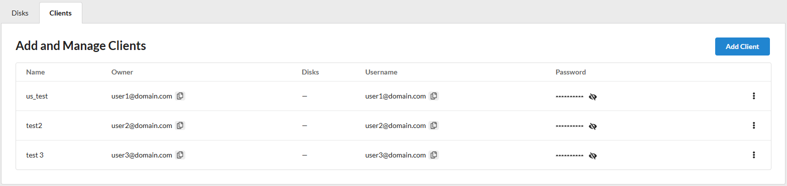 To connect to disks, the ICDC Storage user must specify which clients are allowed to access which disk or disks.